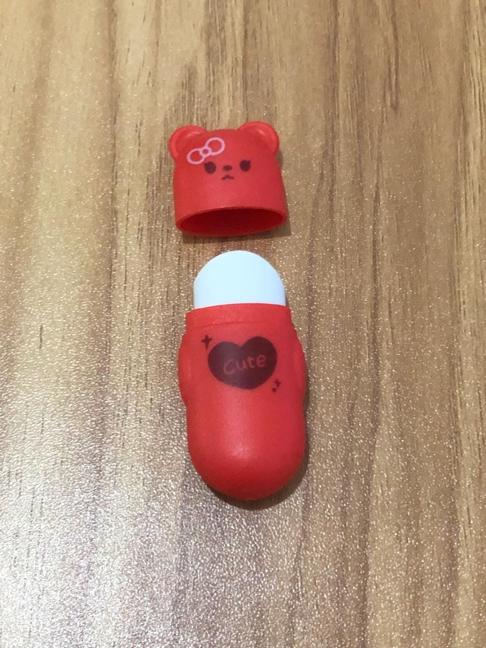Borracha ursinho fofo cor vermelha tem uma tampa removível em forma de cabeça de urso com um laço rosa desenhado no canto superior esquerdo.