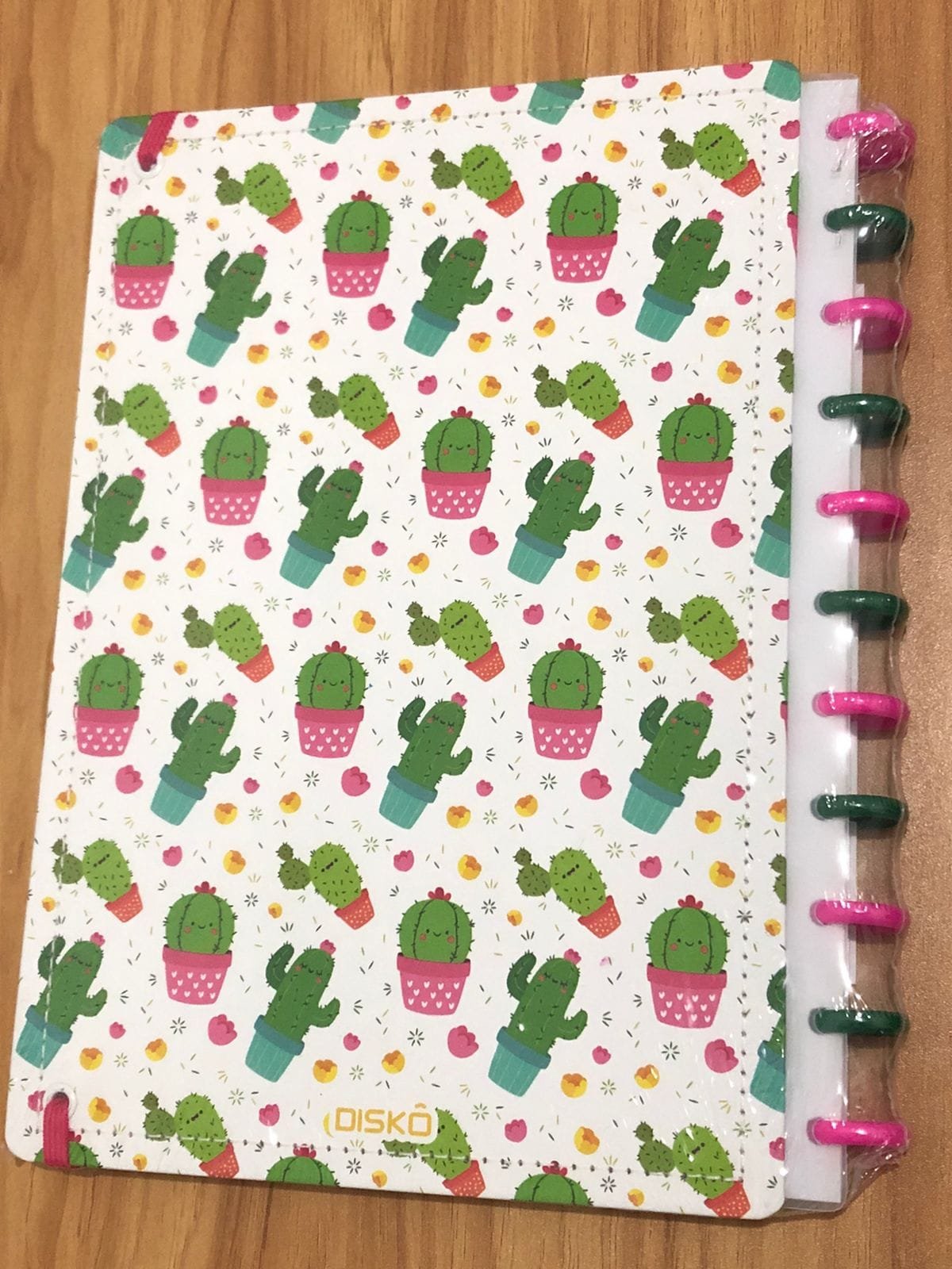 Este é o Caderno Cactus da marca Diskô, um modelo personalizável com folhas reposicionáveis e encadernação por discos. A capa dura é decorada com ilustrações de cactos em vasos coloridos, trazendo um visual vibrante e divertido. O fechamento é feito por um elástico rosa, e os discos laterais são coloridos em tons de rosa e verde, combinando com o tema.