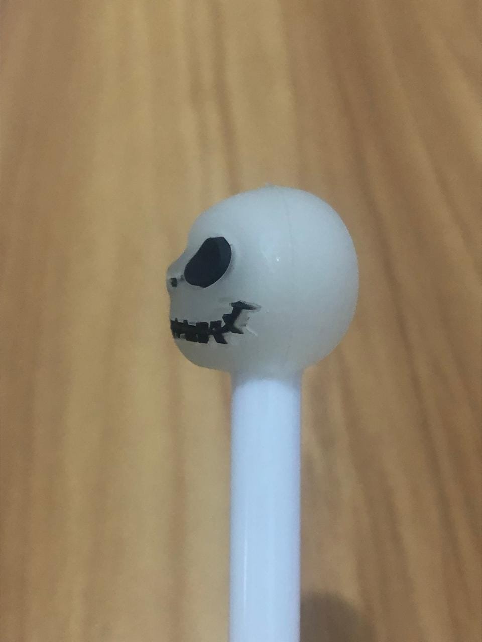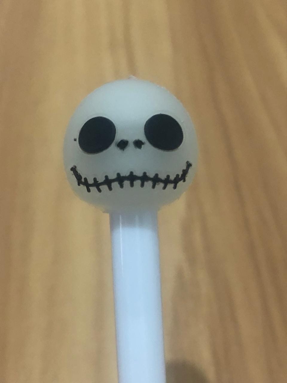 O destaque da caneta é um enfeite no topo em forma de cabeça (Jack), com olhos e boca desenhados em preto.
