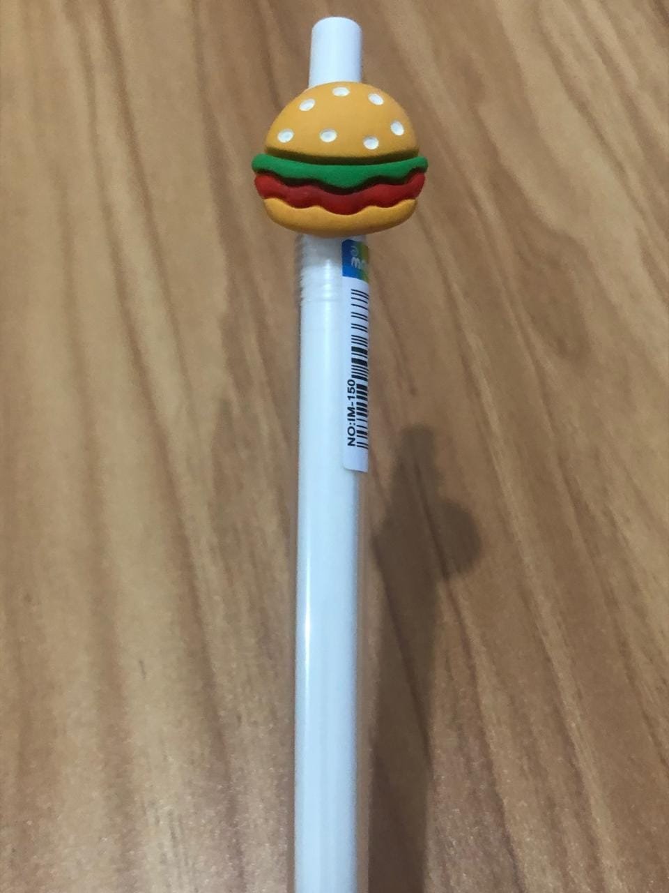 Ela tem um design divertido e criativo, com um corpo branco e um topo decorado em formato de hambúrguer. A decoração inclui um pão com gergelim, alface, tomate e queijo, criando um visual irresistível para quem ama itens de papelaria temáticos.