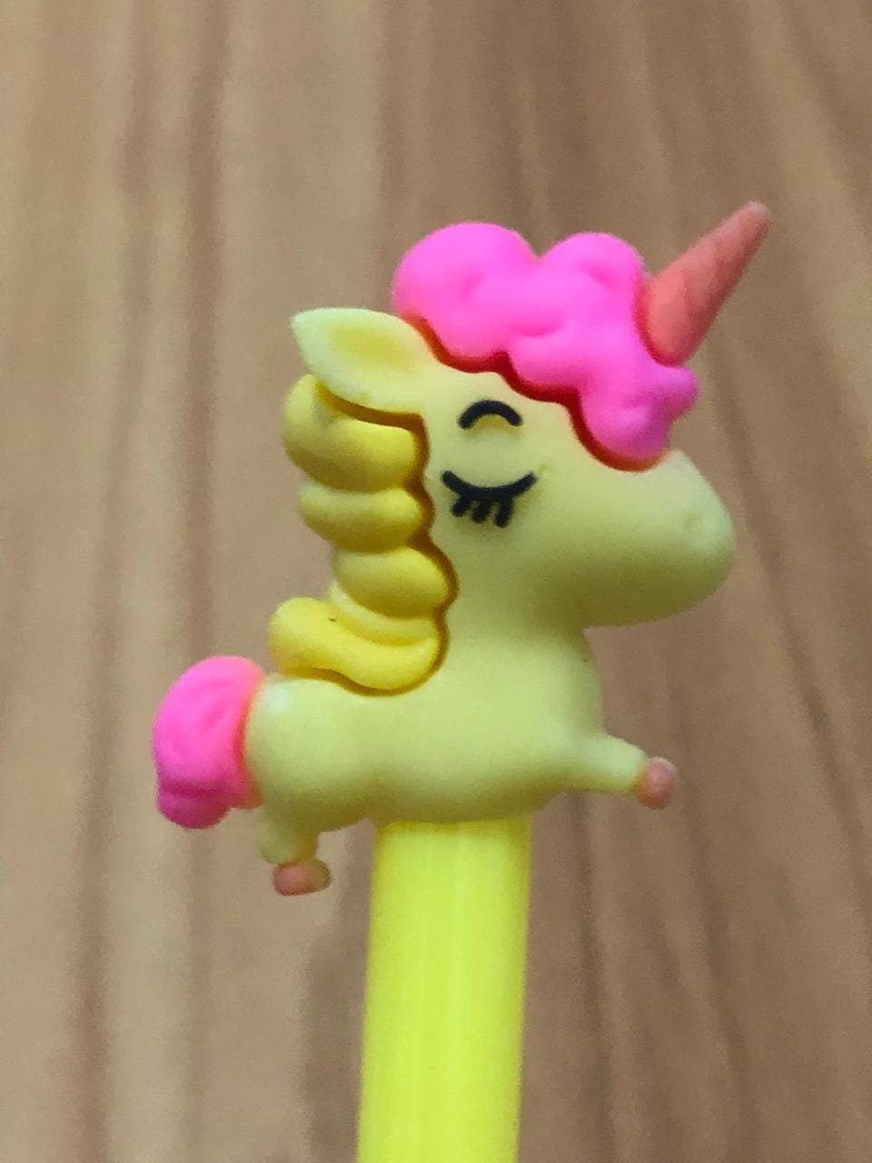 No topo da caneta, há um enfeite em forma de unicórnio.