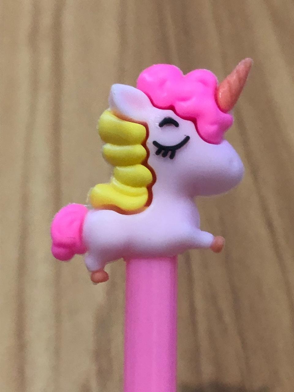 O corpo da caneta é completamente rosa, e o enfeite de unicórnio é predominantemente branco com detalhes em rosa, amarelo e laranja.