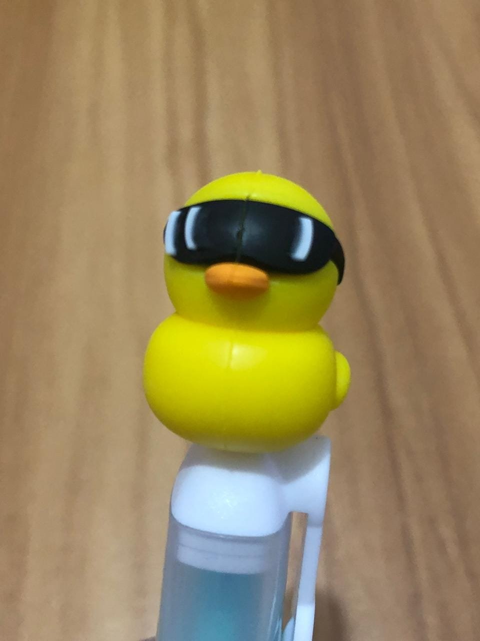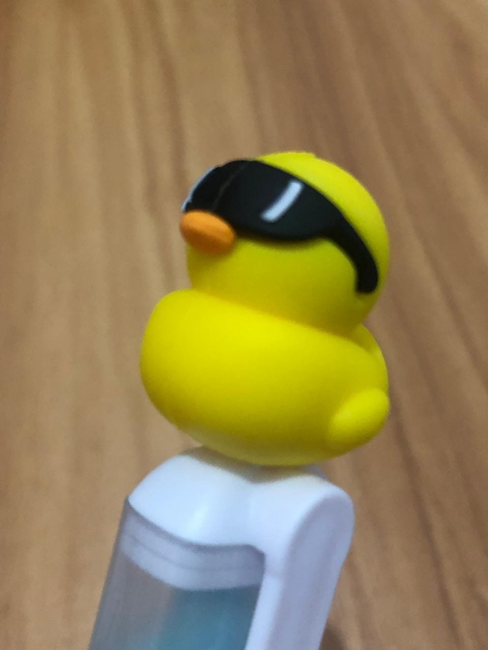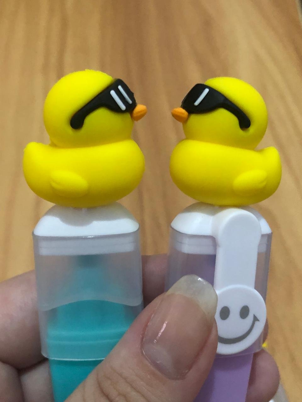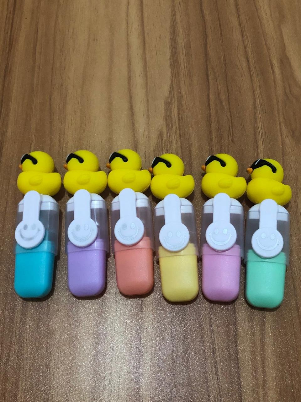 Um detalhe encantador é que cada marcador tem uma tampa decorada com um pato amarelo de óculos de sol pretos, dando um toque divertido e estiloso ao conjunto.