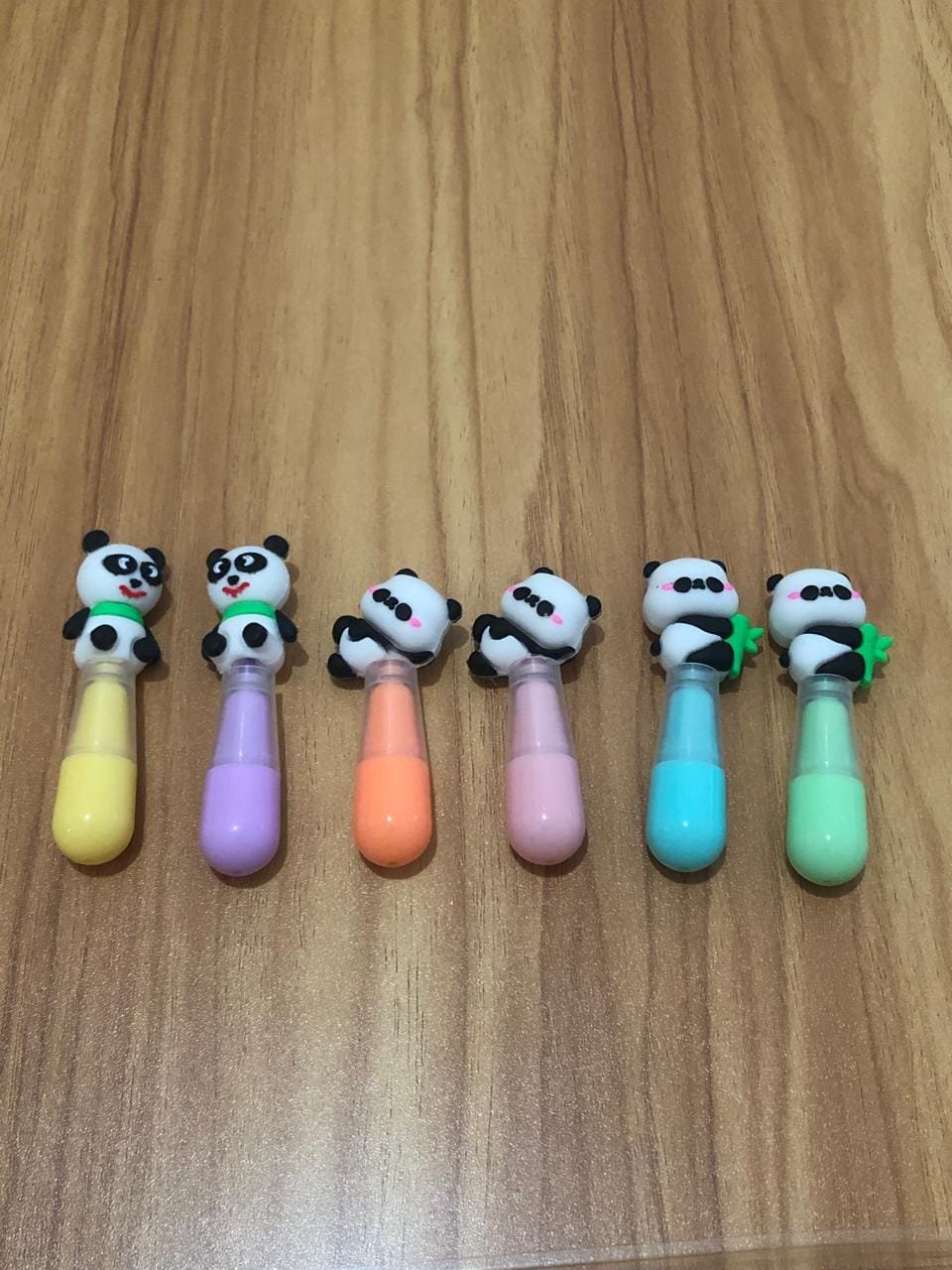 Ele conta com seis marcadores, cada um com uma tampa decorada com um panda fofo em diferentes posições e expressões.
