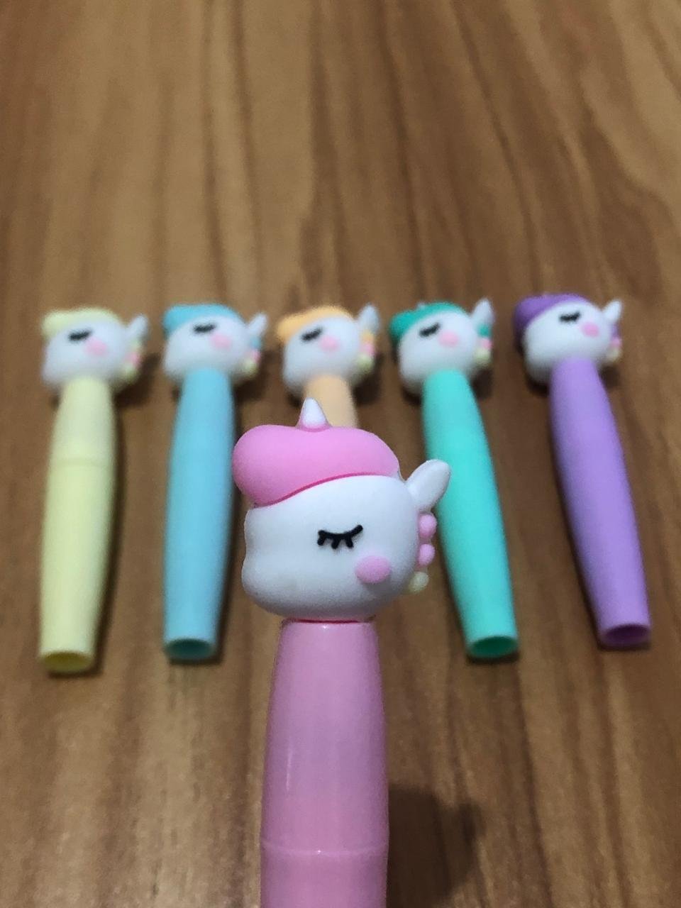 Ele é composto por seis canetas, cada uma decorada com tampas em formato de cabeça de unicórnio. Esses unicórnios têm um design encantador, com olhos fechados, bochechas rosadas e crinas coloridas.