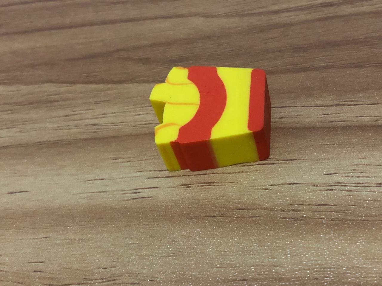 A parte superior da borracha apresenta pequenas formas que lembram batatas fritas saindo da embalagem, o que a torna ainda mais lúdica.